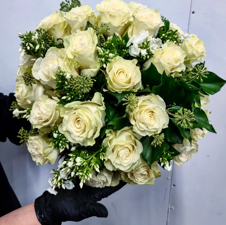 Indulge in the captivating charm of our White Mondial rose bouquet adorned with verdant greenery and delicate White Phlox, where each element comes together to create a symphony of elegance and tranquility. Elevate your surroundings with the timeless beauty and understated sophistication of nature's most beloved blooms.